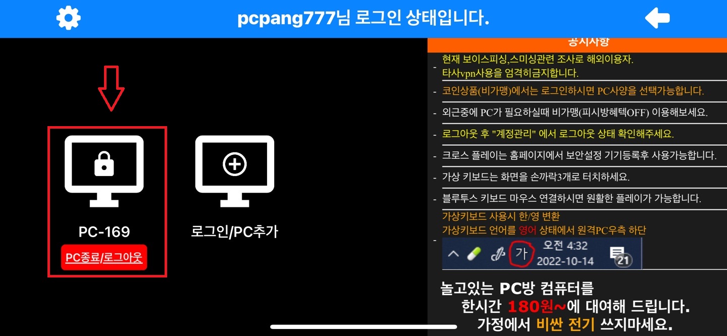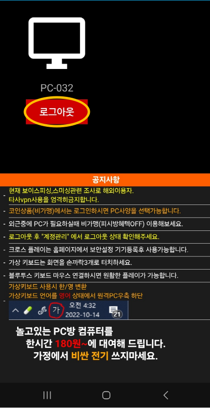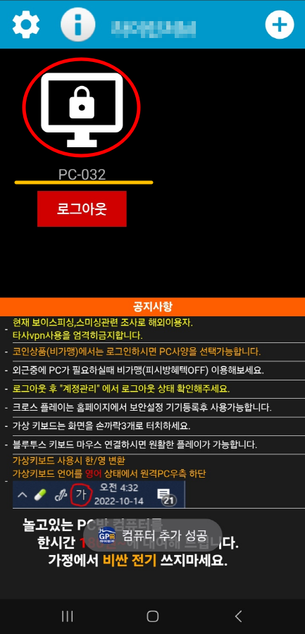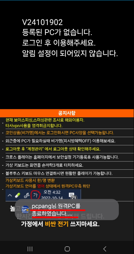 꼭 원격PC 로그아웃 종료를 눌러야 서비스가 꺼집니다!